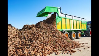 ![]() Drakkar's Revolutionary System The Drakkar has an industrial hermetic conveyor belt that moves the material during the unloading operation. This high-resistance conveyor belt is rolled up on a cylinder driven by 2 hydraulic engines at the back of the tapered trailer body (+ 4 cm at the front). During unloading, the front wall, together with the conveyor belt, moves backwards to accompany the material without compressing it. At the end of the operation, it can have a pushing effect resulting in compact and firm heaps, if the user wishes to. The transparent perspex plate (10 mm thick) on the front wall ensures an excellent visibility when loading and unloading. The floor and the wall resume their initial positions thanks to a hydraulic engine at the front of the trailer, which is connected to a system with a yaw chain. This revolutionary system therefore allows a safe unloading without dumping, even inside buildings, without compressing the transported material. The emptying speed of the Drakkar is optimised to less than 1 minute with any type of product. At the end of the emptying process, the driver only makes the conveyor belt go one meter back while closing the door, before returning to the field. With a simple impulse, the conveyor belt will return automatically to the front position to receive a new load.